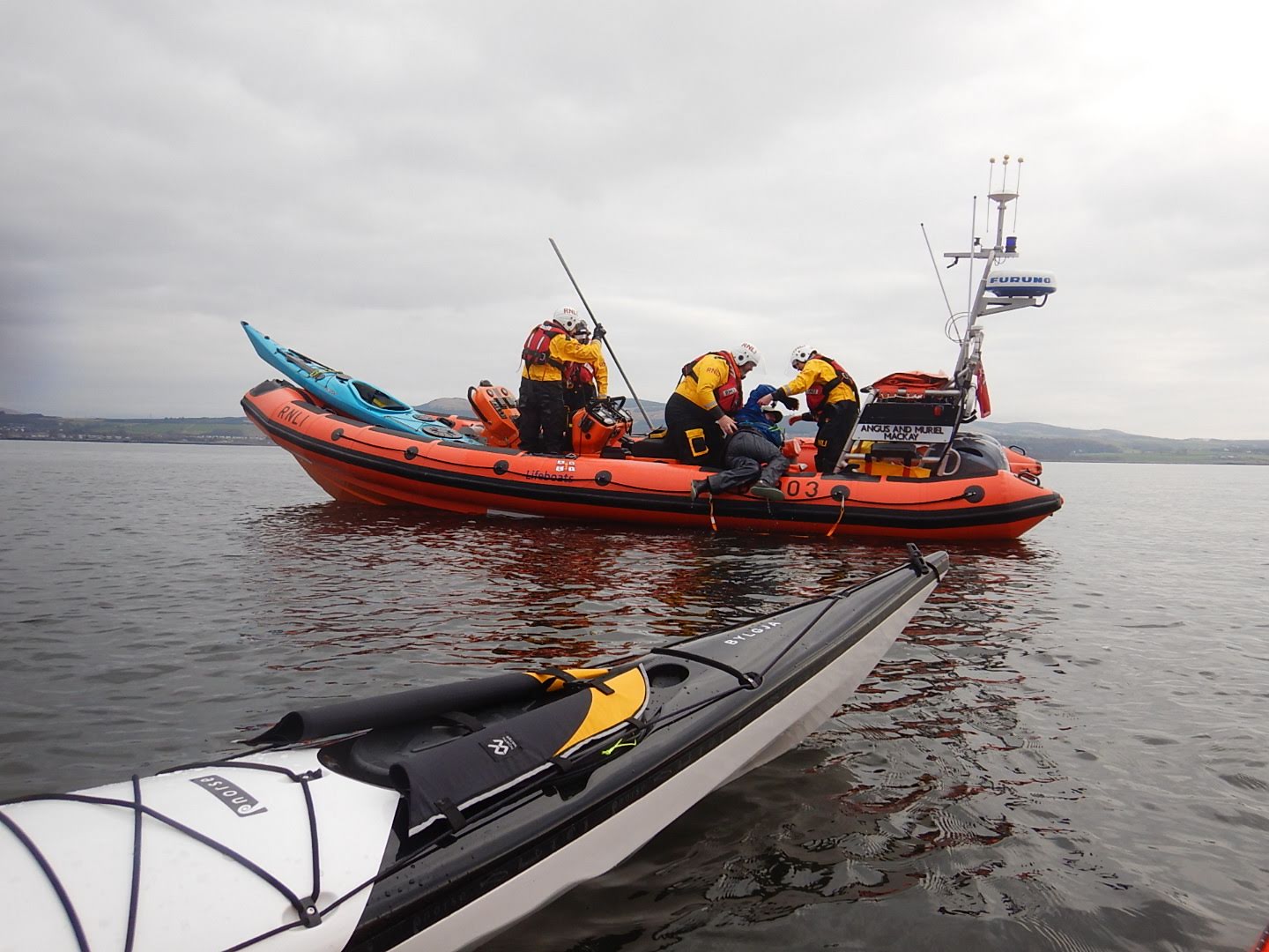 A suggestion for lifeboat crew: if pulling a kayak up onto the Rib, lift by bow so that it drains.